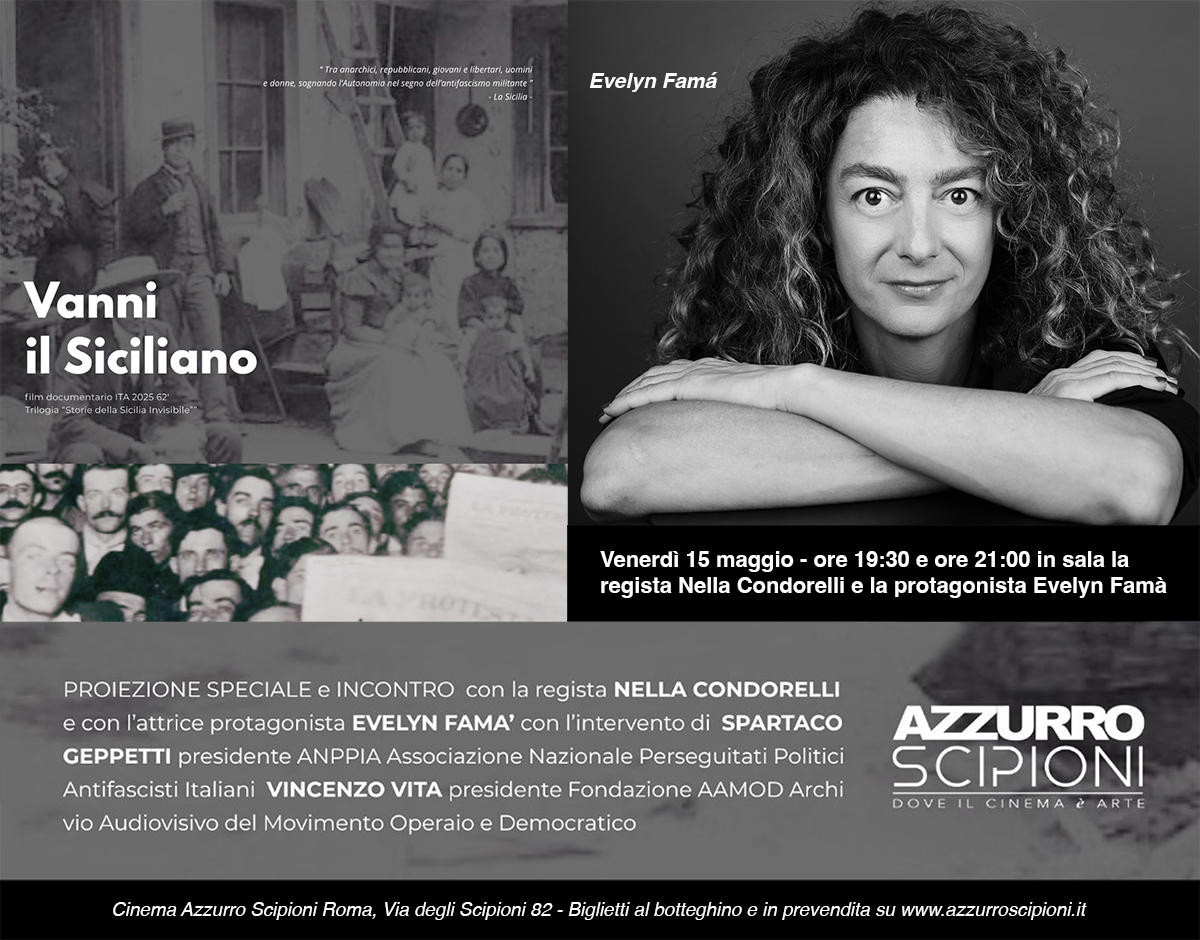 Evelyn Famà e la regista del documentario VANNI IL SICILIANO Nella Condorelli, saranno presenti in sala(ore 21:00)per la visione del film che sarà proiettato allo storico cinema Azzurro Scipioni di via degli Scipioni 82 a Roma. Proiezioni ore 19:30 e ore 21:00